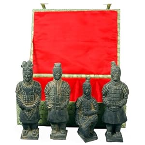 In 1974, the vast burial chamber of third-century Chinese Emperor Qin Shi Huang was discovered by farmers in the north-central Shaanxi Province. It contained more than 7,000 life-size terra-cotta warriors. This set of four handcrafted six inch terra-cotta models of classic poses general, soldier, and archer arrives in a silk gift box.